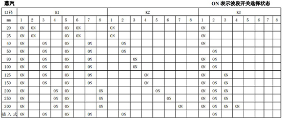 以上表值僅供參考,實際使用中因液體粘度和氣體密度不同應在此值附近調整,頻率低時可將 K3 向大口徑方向調一至三檔。頻率高時可將 K2 向小口徑方向調一至三檔。